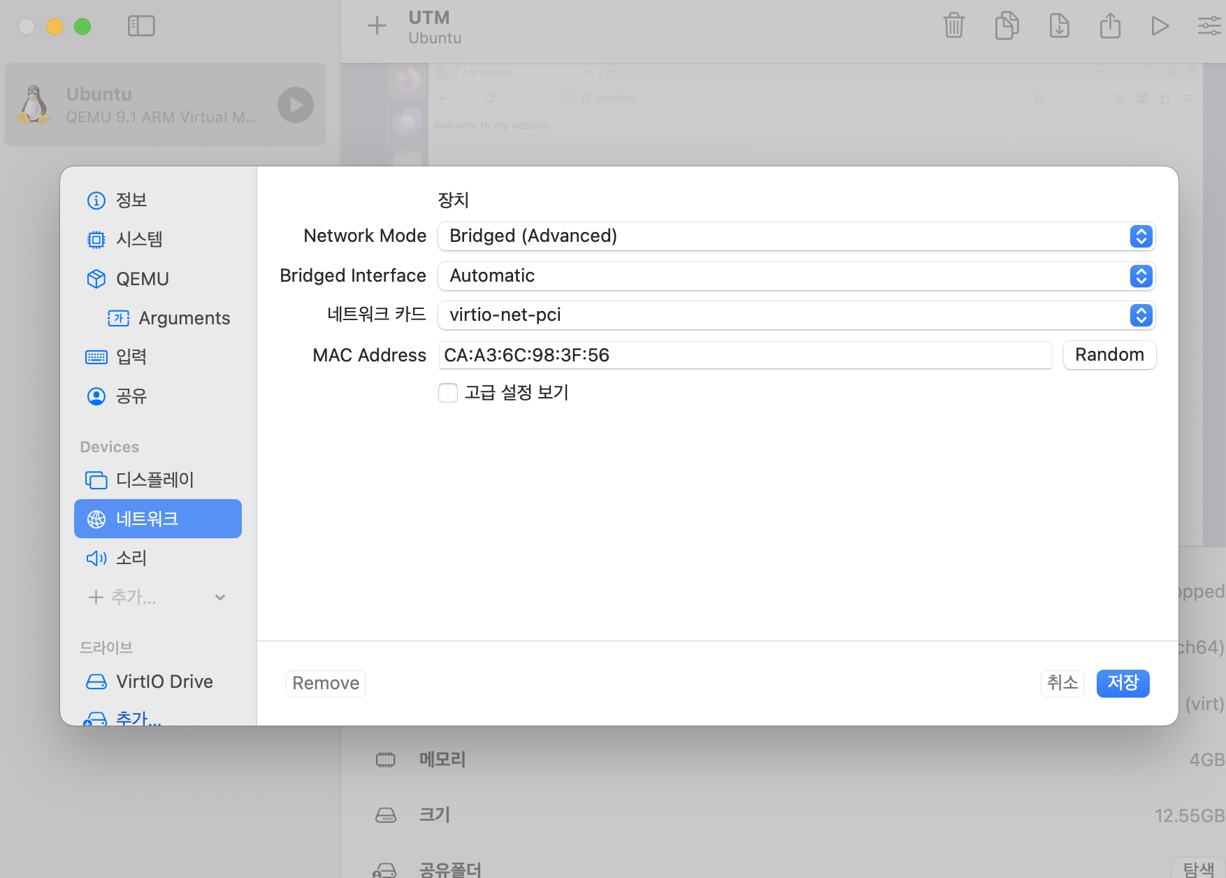 먼저, VM을 종료하고 UTM에서 해당 VM을 설정하여 settings -> Network로 들어간다.
